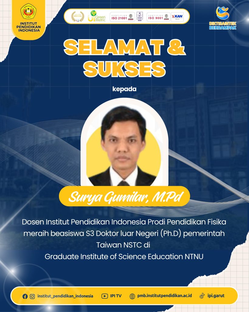 Program Studi Pendidikan Fisika IPI Garut dengan bangga mengucapkan selamat dan sukses kepada Surya Gumilar, M.Pd., dosen Program Studi Pendidikan Fisika, yang berhasil meraih Beasiswa S3 Luar Negeri (Ph.D) dari pemerintah Taiwan melalui National Science and Technology Council (NSTC).